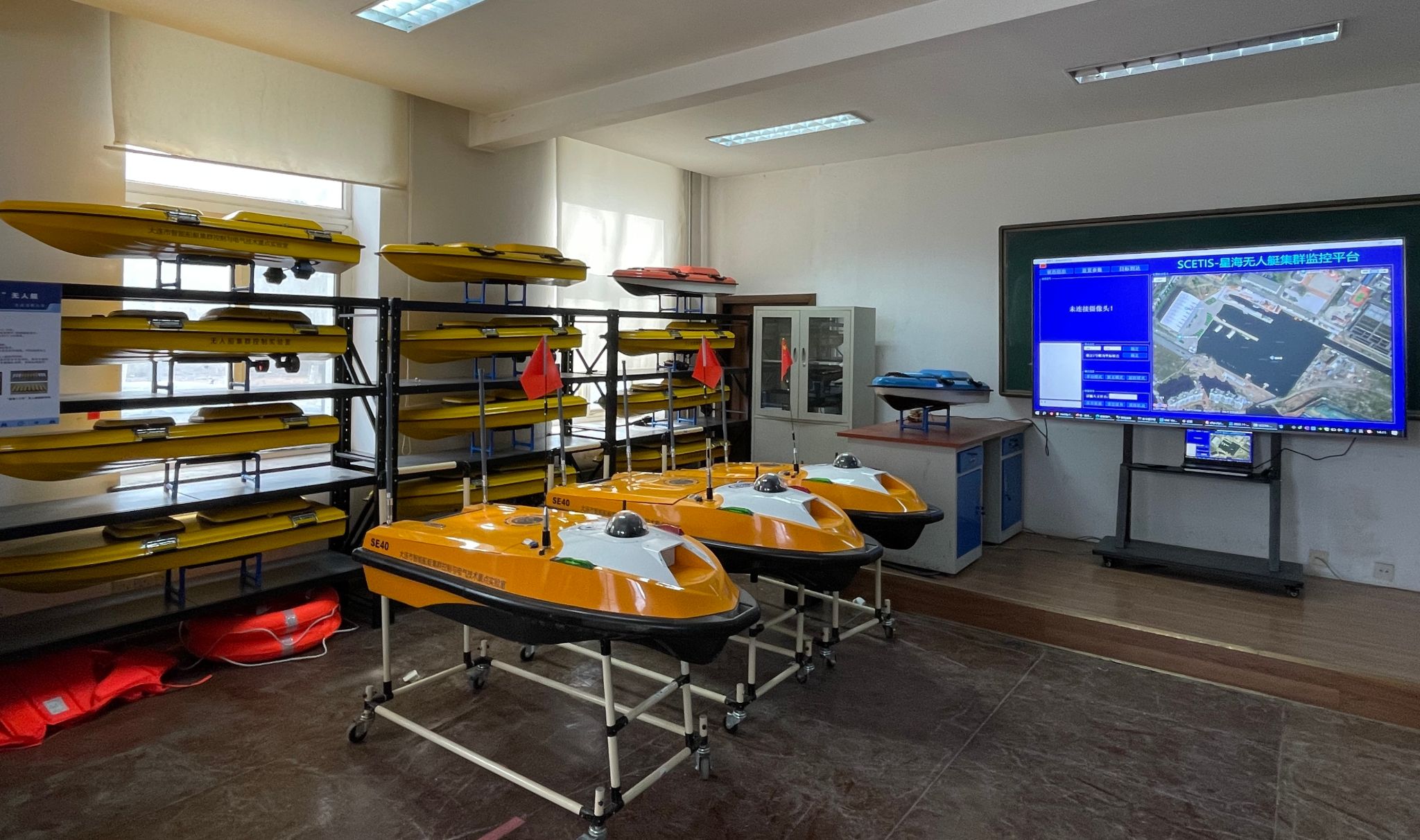 实验室拥有国内一流的智能船艇集群控制与电气技术研发和实验平台,自主研发了多套无人船艇集群系统与控制平台,开发了大规模无人艇远程指挥控制系统(200艘),构建了无人船编队物理模型实验平台,支撑智能船舶、无人艇集群、无人气垫艇、深海空间站、无人水下航行器等智能控制技术的测试验证。在智能船舶电气系统方面,配备了智能船舶电网模拟器、智能船舶储能电池组、智能船舶交直流变换器、电力电子实时仿真平台、快速原型控制器等实验设备,能为船舶电力系统分析、船舶电能变换技术、船舶电气系统控制技术、船舶能量管理技术等提供可靠的实验平台支撑。