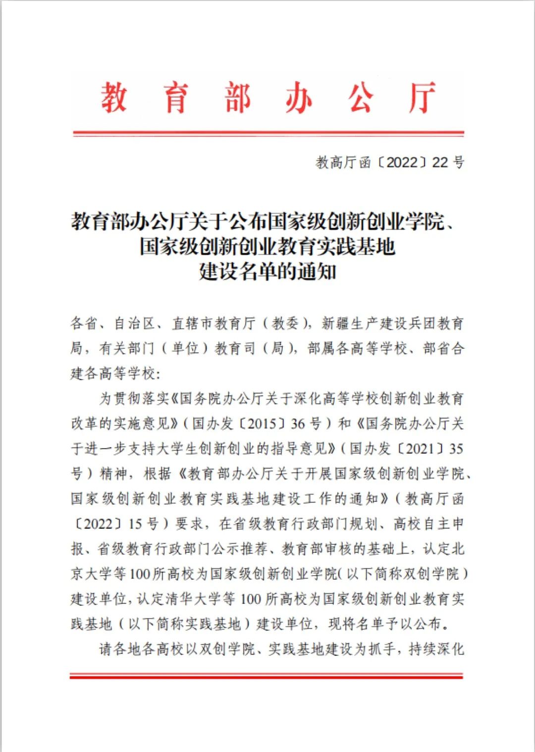 近日,教育部办公厅发布了《关于公布国家级创新创业学院、国家级创新创业教育实践基地建设名单的通知》(教高厅函〔2022〕22号),beat365官方网站获首批“国家级创新创业教育实践基地”建设单位。这是beat365官网继2019年获评全国创新创业典型经验高校(50强)、2020年Hi-C空间获国家级众创空间之后,持续推进创新创业教育改革工作获得的又一国家级殊荣!
