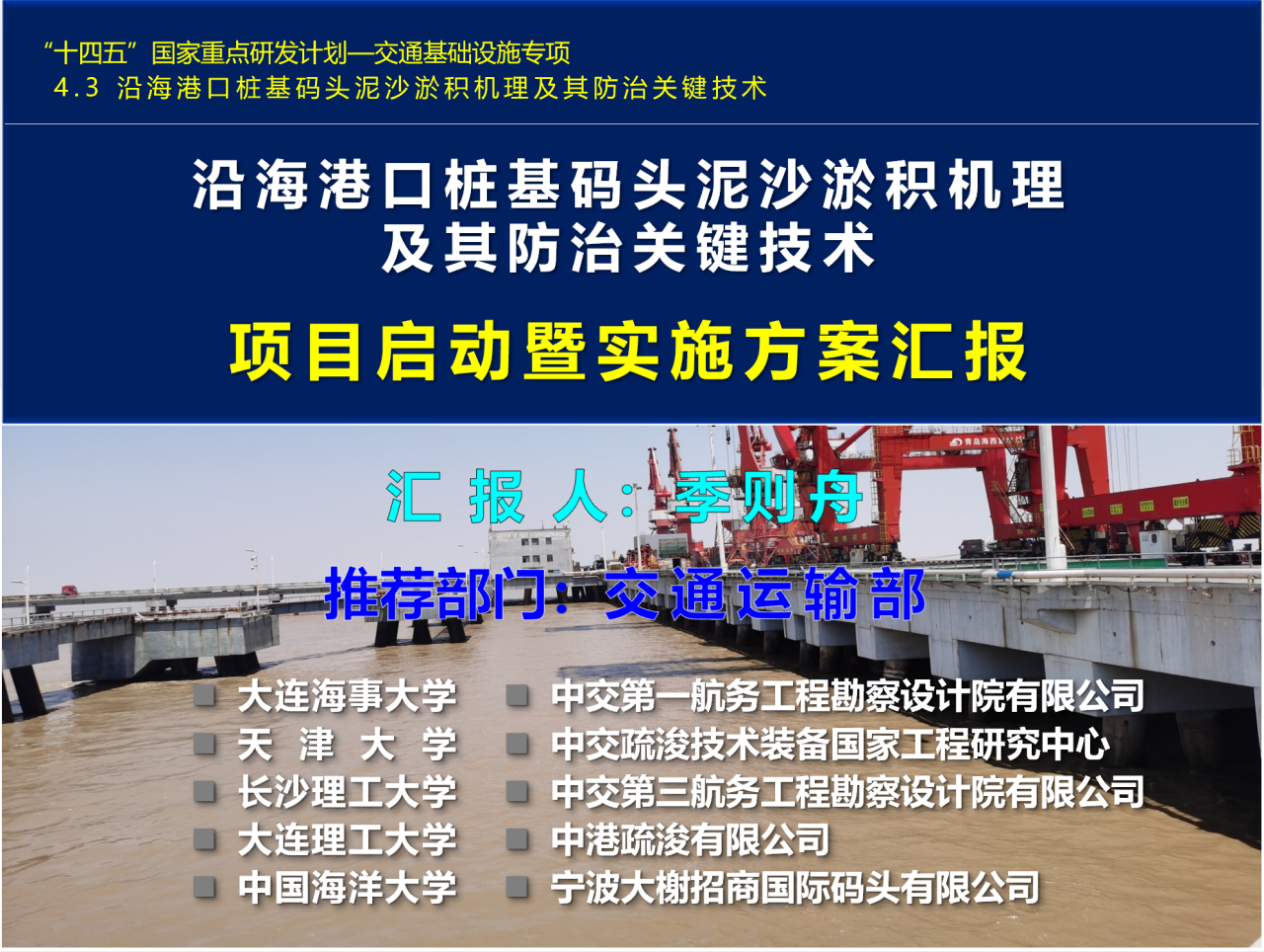 5月27日,由beat365官网牵头实施的国家重点研发计划项目“沿海港口桩基码头泥沙淤积机理及其防治关键技术”启动暨实施方案论证会在大连召开,本次会议采用线上+线下相结合的形式进行。科技部高技术中心项目主管张长亮和程竹静、交通运输部科技司副处长张成、中国工程院院士李华军、澳大利亚工程院院士程亮、中国城市规划设计研究院马林、交通运输部天津水运工程科学研究院副院长张华庆、交通运输部原总工徐光、交通运输部原巡视员解曼莹、河海大学副校长郑金海、全国水运工程建造大师顾明、南方科技大学教授余锡平、四川大学教授林鹏智、大连理工大学教授伊廷华、天津大学教授王元战及项目各课题负责人和骨干成员等78人参加了会议。副校长初北平代表学校参加会议,会议由科技处处长弓永军主持。