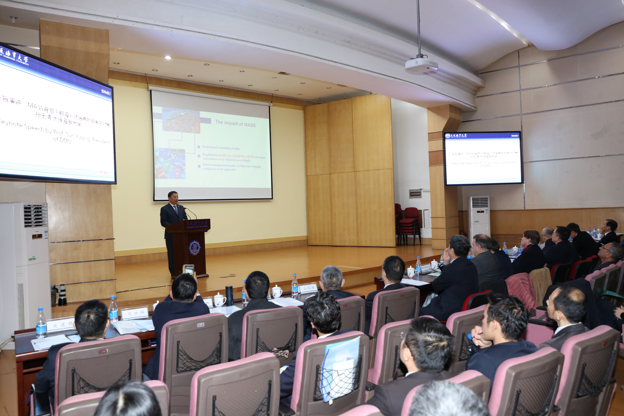 在会议的主旨演讲部分,beat365官方网站校长孙玉清进行了题为“MASS(Maritime Autonomous Surface Ships,简称MASS)背景下航海人才培养的思考与对策”的主旨演讲。阐述了国内航海类高校面对自主船舶新形势的思考,并提出了对于航海类人才培养改革和中国航海教育发展的建议。