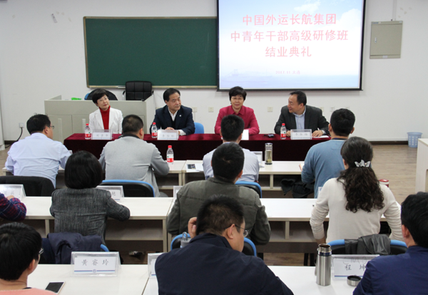 11月10日下午,中国外运长航集团中青年干部高级研修班结业典礼在专业学位教育学院202教室举行,标志着本期研修班圆满结业。中国外运长航集团(以下简称集团)党委副书记、纪委书记张杨,集团工会主席、人力资源部总经理刘京华,学校纪委书记李信标、专业学位教育学院院长李振福,以及参加此次研修的所有24名中青年干部出席典礼。典礼由李振福主持。