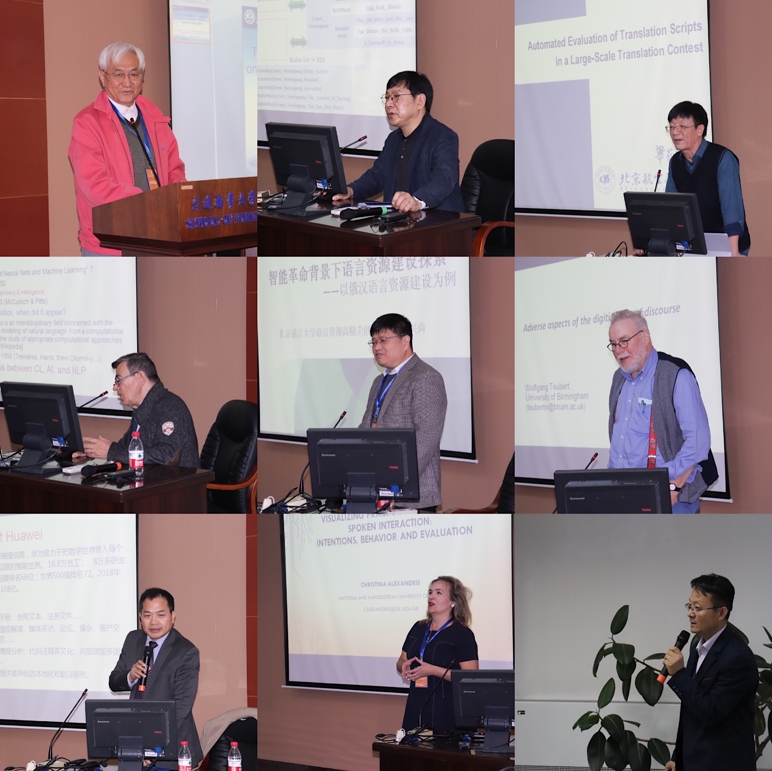 开幕式后举行了为期一天的主旨报告。国家教育部语言文字应用研究所研究员冯志伟教授、韩国科学技术院计算机科学Key-Sun Choi教授,北京航空航天大学梁茂成教授、法国格勒诺布尔大学Christian Boitet教授、语言资源高精尖创新中心特聘研究员傅兴尚教授、英国伯明翰大学Wolfgang Teubert教授、希腊雅典大学Christina Alexandris副教授、中国翻译协会第七届理事会副会长兼本地化委员会陈圣权教授、大连外国语大学语言学研究基地主任邓耀臣教授先后进行主旨发言。与会专家学者从不同角度,介绍智能时代发展大势,通过丰富案例、建构语言模型,围绕机器翻译优缺点、智能翻译技术、计算机语言处理、语料库语言学研究等议题,深入开展人工智能时代对语言学及其教学的研究探讨。此外,与会专家学者还围绕人工智能翻译技术的最新研究成果、人工智能翻译技术下一步研究发展开了交流讨论。