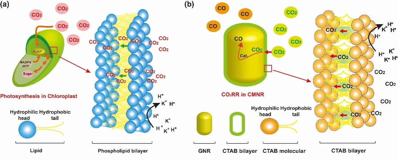 在本工作中,该研究团队创新性地将十六烷基三甲基溴化铵(CTAB)等双极性分子膜组装于金纳米棒催化剂表面,成功构建了仿叶绿体的纳米反应器,实现了CO2高活性、高选择性电还原制备一氧化碳(CO)的反应过程。实验和理论研究表明,CTAB分子在金纳米棒表面呈现仿叶绿体膜的双层排布,CTAB分子中的-N(CH3)3结构单元和脂肪碳链组成的疏水通道分别对CO2的捕获和传输起到关键作用;并且CTAB双层分子结构延缓了质子供体水分子的传输,从而有效调控到达催化活性中心表面CO2和水反应物的浓度。此外,溴离子可使金纳米棒表面呈现部分氧化态,有效稳定CO2电还原反应中间产物COOH*,进一步提升了CO2电还原性能。因此,在该仿叶绿体纳米反应器中,CTAB双层分子可模拟叶绿体双层膜实现CO2选择性透过,金纳米棒模拟Rubisco酶对富集的CO2进行高效催化转化,CO2电还原制备CO反应的法拉第效率达到92.1%(–0.54 V vs. RHE)。本研究为实现高效CO2资源化转化提供了一种新的仿生路径,并有望拓展到其它可再生能源转化利用过程。