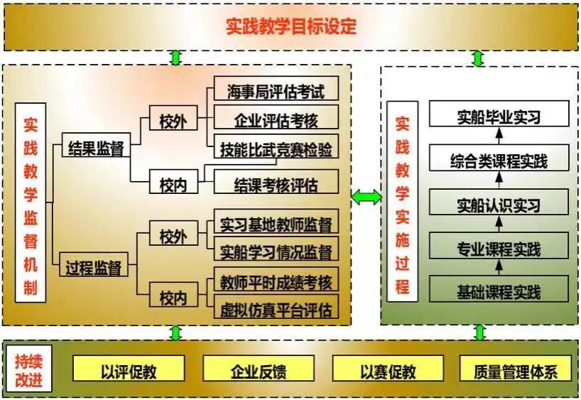在学生发展、培养目标、毕业要求、持续改进、课程体系、师资队伍和支撑条件等方面厚植工程教育理念,建立基于PDCA(策划-实施-检查-改进)循环改进原则的实践教学目标设定、过程实施、过程监督、教学支持改进的航海类专业工程实践教育质量监督反馈模式。