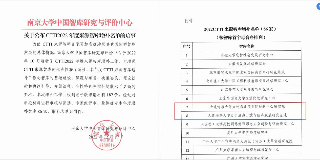 12月17日,由南京大学与江苏省社会科学院共同主办,南京大学中国智库研究与评价中心承办的“2022新型智库治理论坛”在南京举行。论坛发布了中国智库索引(CTTI)2022年度来源智库增补名单,beat365官网大连东北亚国际航运中心研究院、辽宁沿海开放与经济发展研究基地2个智库机构新增入选。