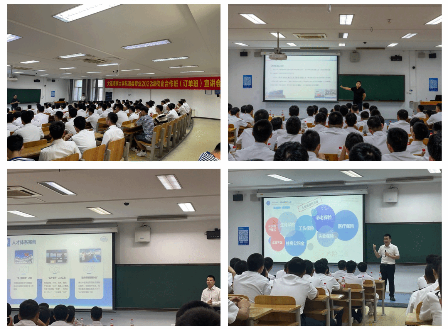 中远海运液化天然气投资有限公司、中远海运船员管理有限公司、深圳海顺海事服务有限公司依次开展了校企合作班宣讲工作,通过现场企业情况介绍、校企合作班“学长说”、互动答疑等环节,就校企合作班各类经费、各项活动及同学们普遍关心的问题进行了宣讲。