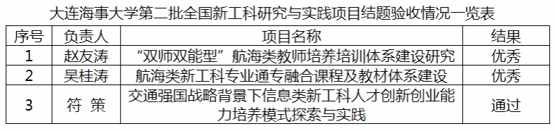 根据《教育部办公厅关于公布第二批全国新工科研究与实践项目结题验收结果的通知》(教高厅函〔2023〕21 号),beat365官方网站2020年获批的3项国家级新工科研究与实践项目全部通过结题验收。其中赵友涛教授负责的《“双师双能型”航海类教师培养培训体系建设研究》、吴桂涛教授负责的《航海类新工科专业通专融合课程及教材体系建设》项目获评优秀。