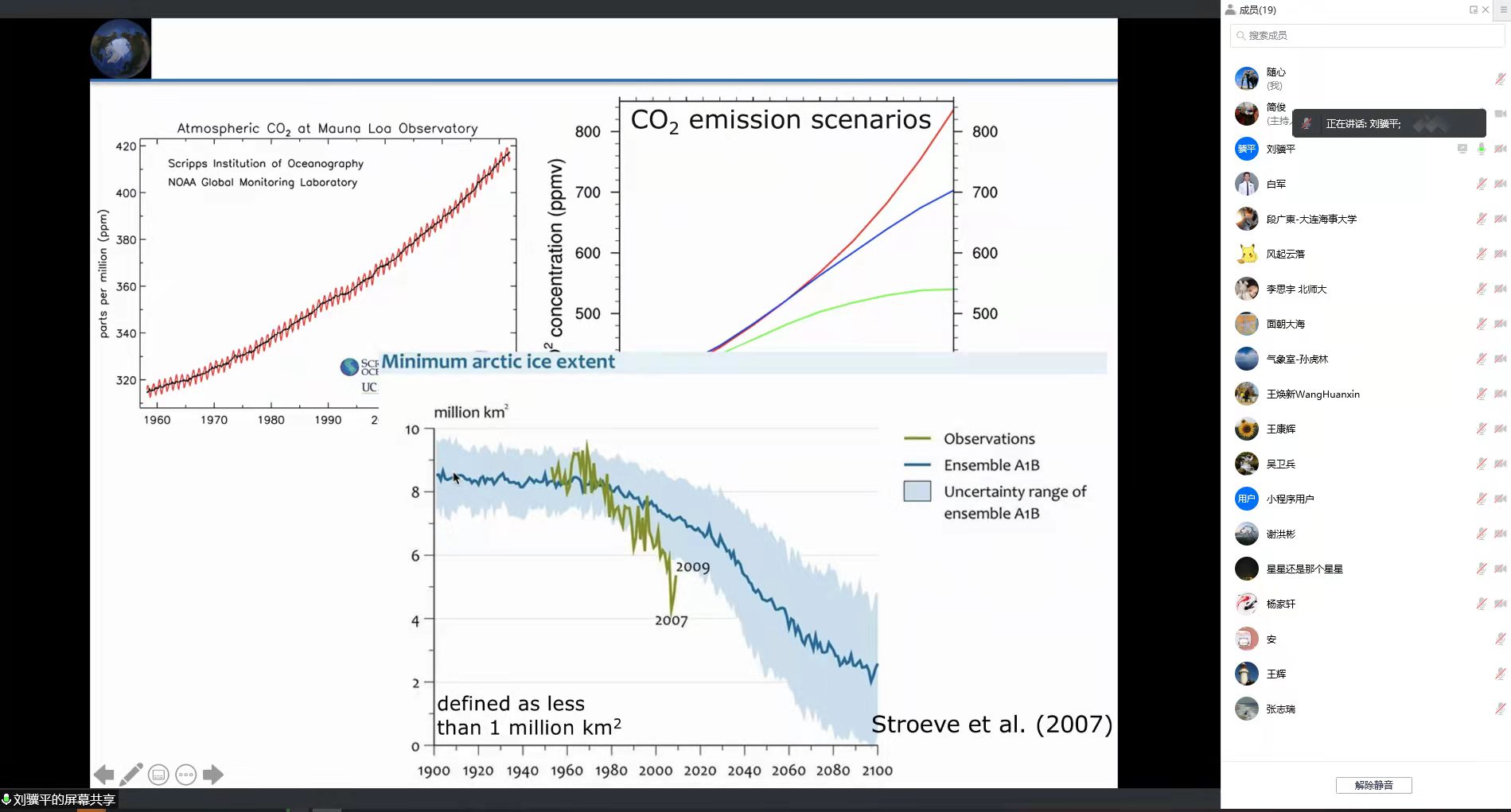 刘骥平教授围绕北极夏季无冰预测的数值研究进展,并简单介绍了自主研发的北极区域模式系统即融合了大气、陆地、海洋和海冰等多个子模式的季节内耦合预测系统。