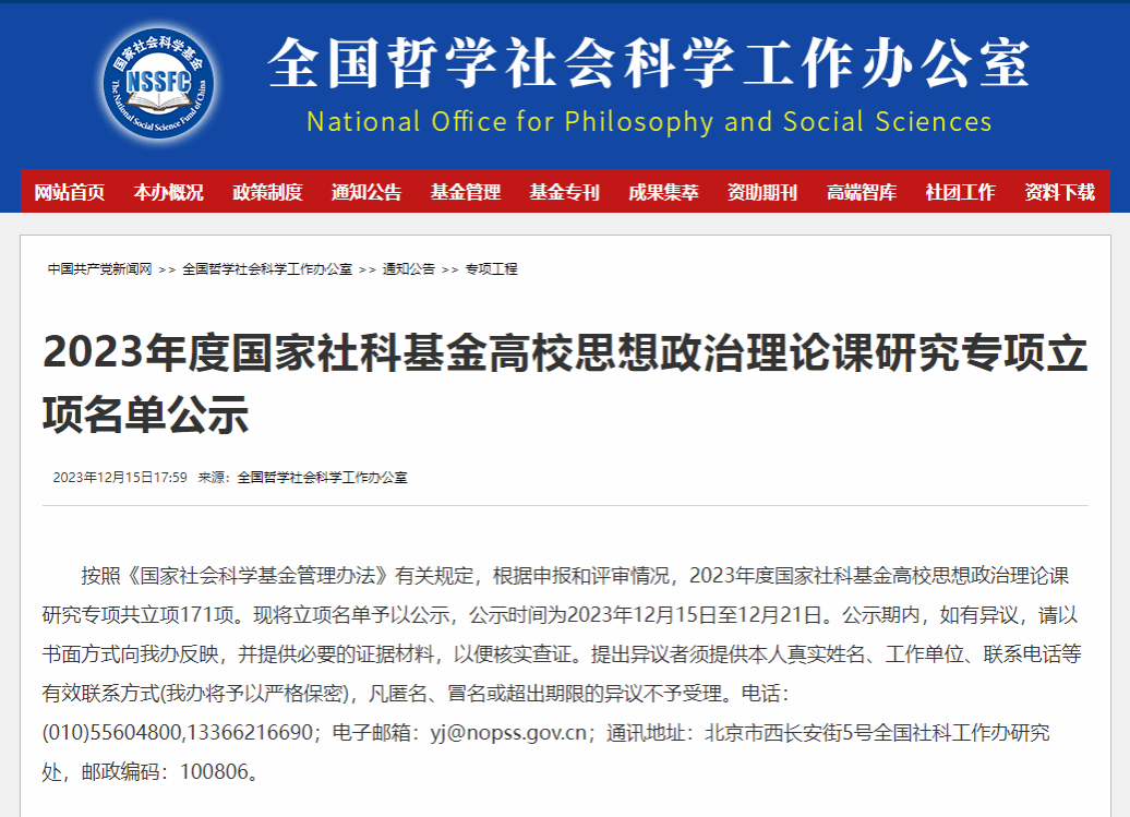 12月15日,全国哲学社会科学工作办公室对外公示2023年度国家社科基金重大项目立项名单、国家社科基金高校思想政治理论课研究专项立项名单。国家社科基金重大项目全国共336个项目拟获立项资助,beat365官网李振福教授主持的项目拟获立项。国家社科基金高校思想政治理论课研究专项全国共171个项目拟获立项资助,beat365官网许民强教授、陈双泉副教授主持的项目拟获立项。