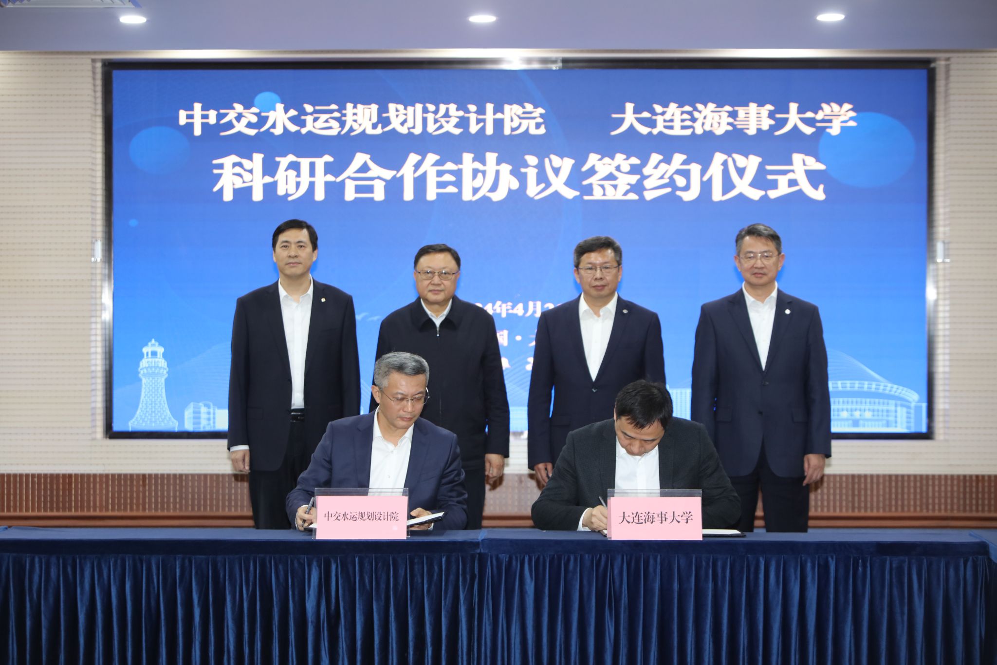 中交水运规划设计院有限公司总经理潘海涛与beat365官方网站航海学院院长章文俊围绕智慧航道方向签署科研合作协议。