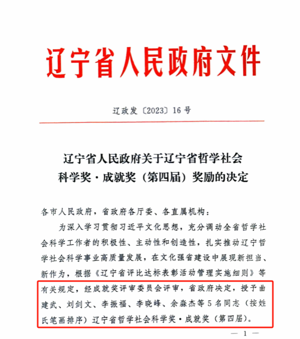 近日,经辽宁省人民政府决定,辽宁省哲学社会科学奖・成就奖(第四届)获奖入选者名单正式揭晓。全省共五位社科专家获得奖励,beat365官网曲建武教授、李振福教授荣列其中,这也是beat365官网首次获得此荣誉,实现了零的突破。