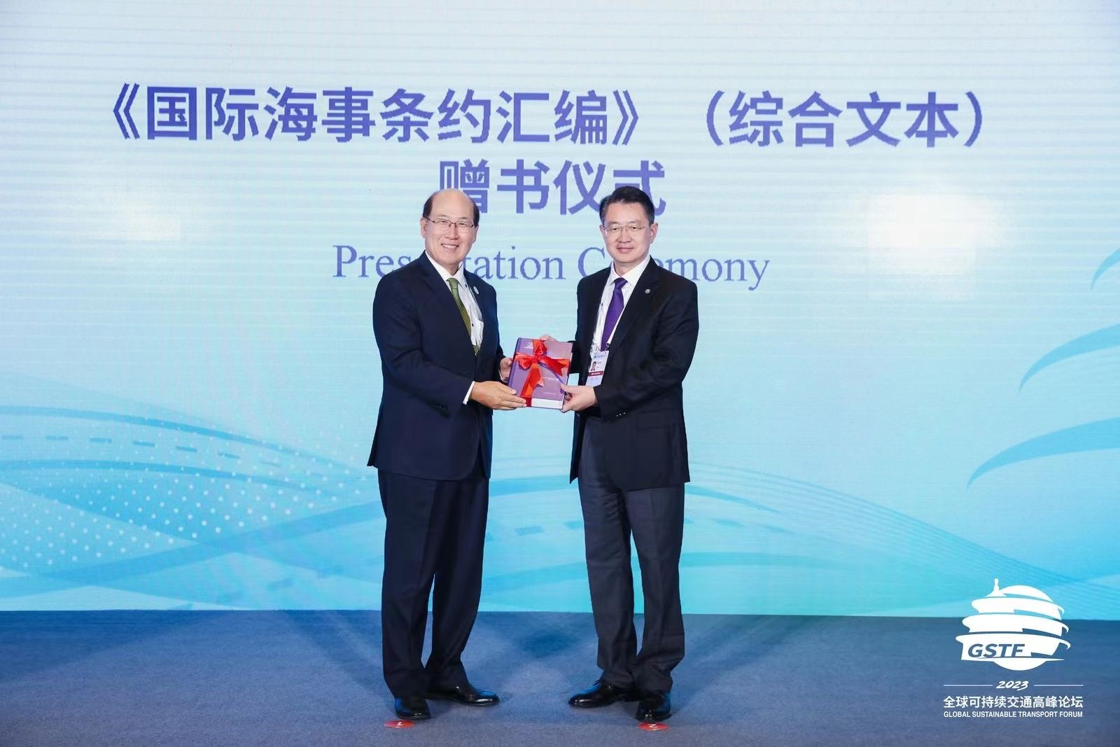在纪念中国恢复IMO合法席位50周年会议上,校长单红军向IMO秘书长林基泽赠送《国际海事条约汇编》(综合文本)