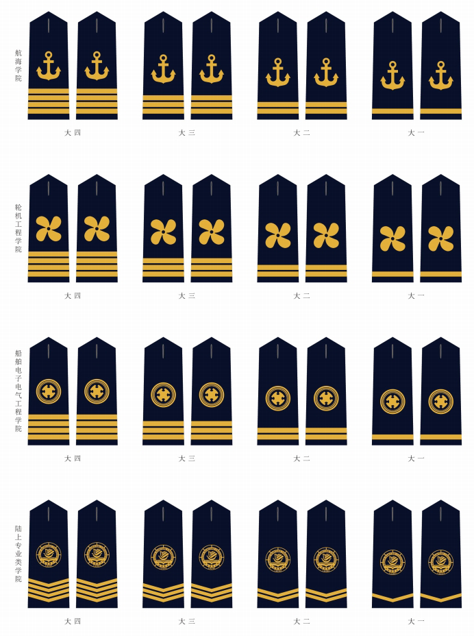 航海类专业本科生肩章中的锚、桨、电机有着鲜明的专业特色,寓示学生对专业的认同感和荣誉感;横杠的数量及粗细代表了不同的年级及是否担任学生干部职务。非航海类专业学生肩章中的校徽标志,寓示学生对海大的归属感和自豪感;本科生折杠的数量代表不同的年级