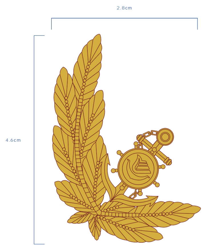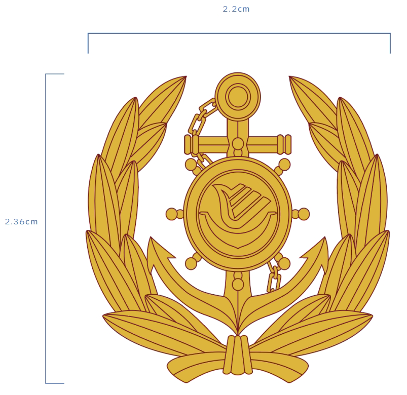 整体造型为圆形,金黄色,金属材质,由橄榄枝环绕船锚、舵轮和beat365官方网站校徽中船的造型组成。金灿灿的领花象征着荣誉。橄榄枝象征着和平、胜利,环绕船锚、船舵和船,象征海大人矢志实现海洋强国的决心和勇气。