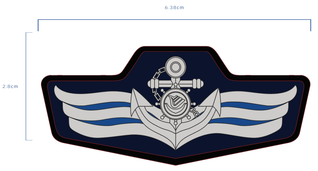 整体造型为船型,红、黄色调搭配,金属帽徽,主体融入五角星、船锚、学校标志性建筑元素,中间空隙处镂空,船体上附56颗立体麦穗造型,整个船体外围由松枝环绕,下部由展开的书页(起伏的海浪)托起。帽托为藏蓝色毛毡。